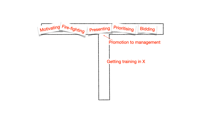 So now you’re in charge you you’re not (just?) doing X, you’re also managing the people who do X, the X-ers… people like you used to be. People who are still doing X. All the training you got over the years to be better and better at doing X isn’t any use any more, because now your problems aren’t X-problems; they’re Xpeople-problems.